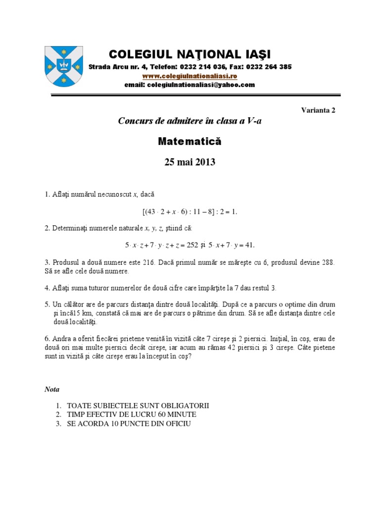 Admitere Clasa A V A Examene Colegiul National Grigore Moisil