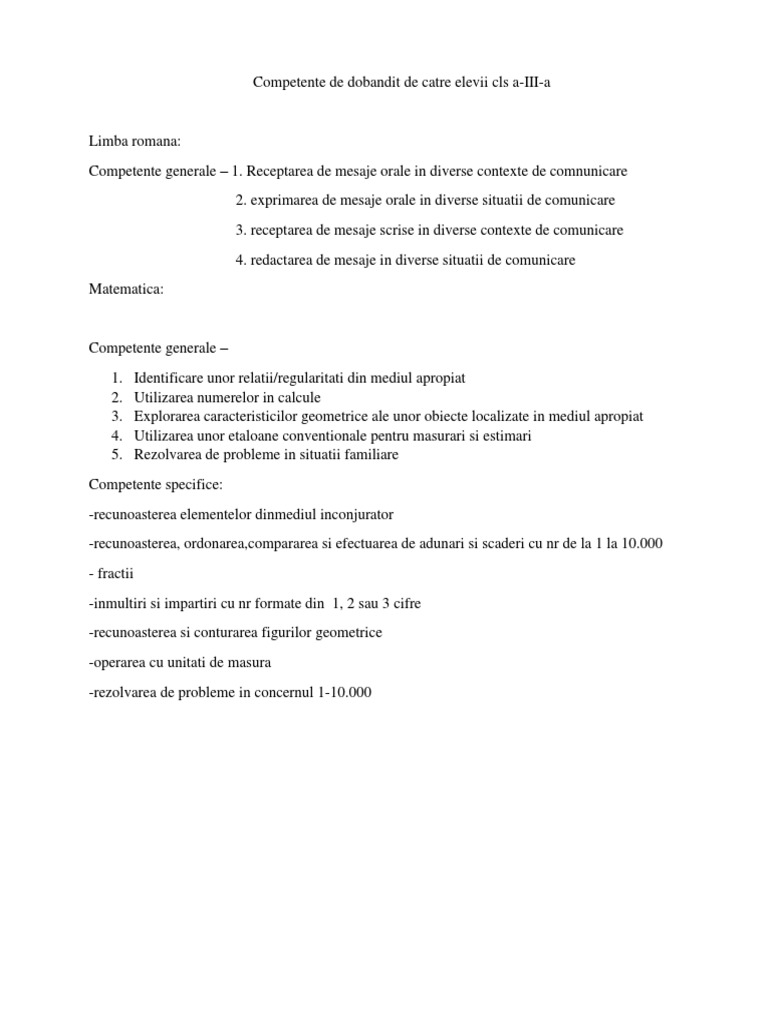 Competente Generale Si Specifice Clasa A Iii A