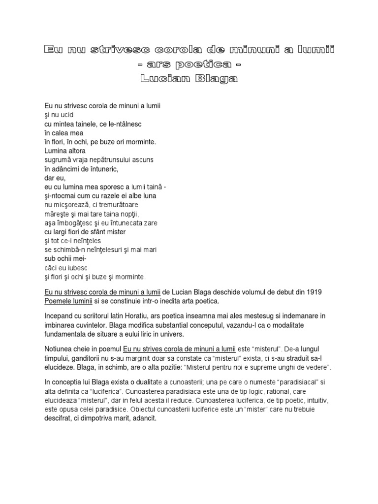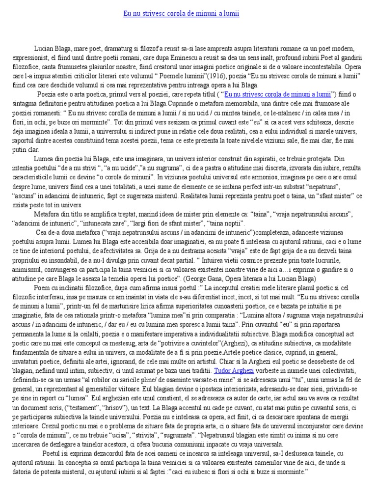 Lucian Blaga Eu Nu Strivesc Corola De Minuni A Lumii Comentariu Bac