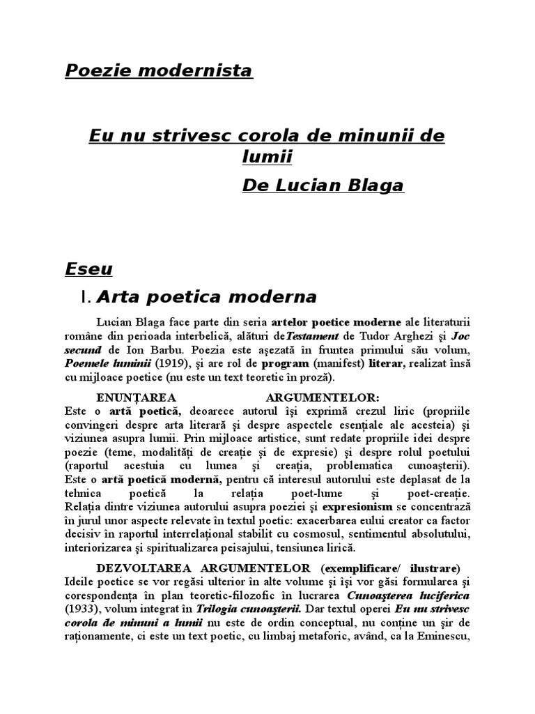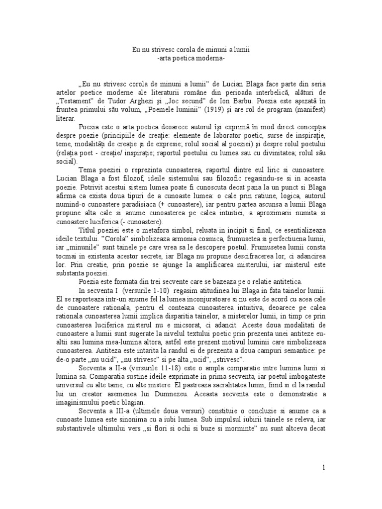 Arta Poetica Moderna Eu Nu Strivesc Corola De Minuni A Lumii