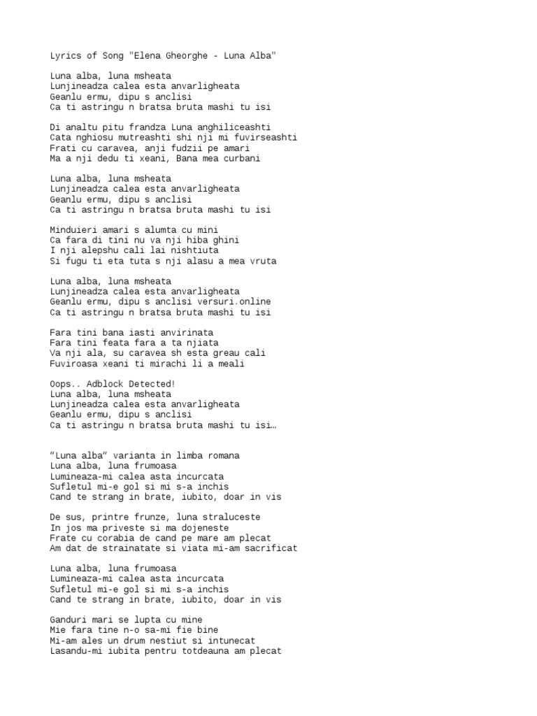 Luna alba fermecata lumineaza calea asta incurcata drmurile sunt inchise cat de mult te strang in brate doar in vise. Luna alba luna msheata lunjineadza calea esta anvarligheata geanlu ermu dipu s anclisi ca ti astringu n bratsa bruta mashi tu isi. Versurile melodiei luna alba interpretata de elena gheorghe luna alba luna msheata lunjineadza calea esta anvarligheata geanlu ermu dipu s anclisi ca ti astringu n bratsa bruta mashi tu isi di analtu pitu frandza luna anghiliceashti cata nghiosu mutreashti shi nji mi fuvirseashti frati cu caravea anji fudzii pe amari ma a nji dedu ti. Elena gheorghe versuri luna alba luna alba luna msheata lunjineadza calea esta anvarligheata geanlu ermu dipu s anclisi ca ti astringu n bratsa bruta mashi tu isi di analtu pitu frandza elena luna alba lyrics.