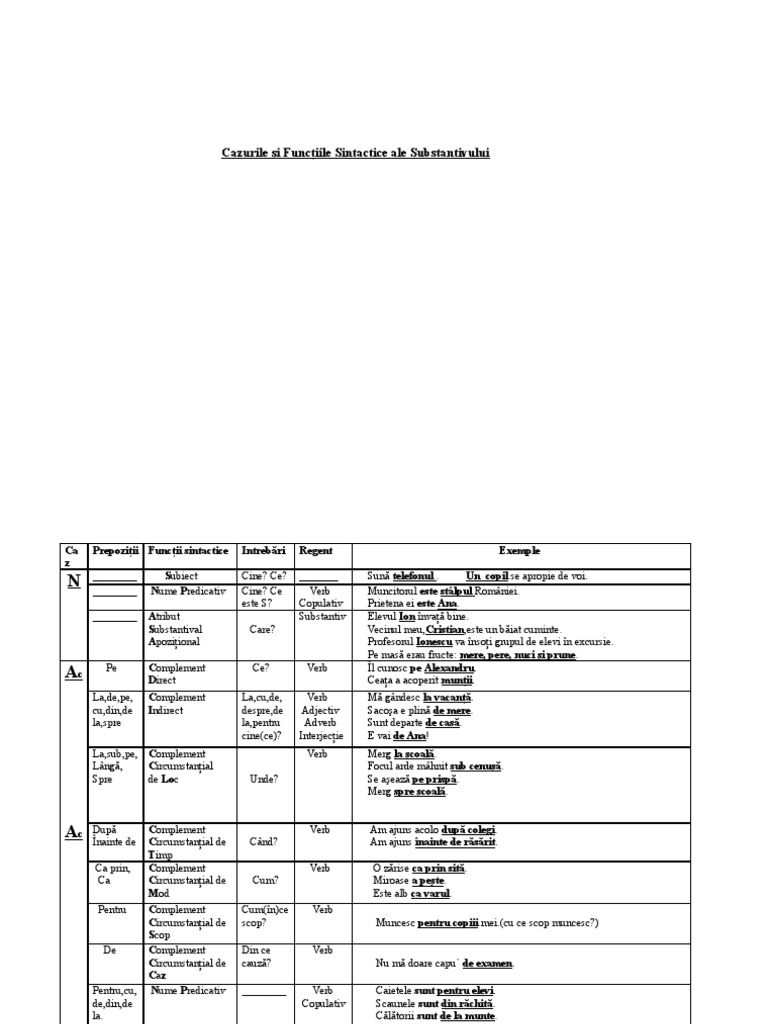 Cazurile Si Functiile Sintactice Ale Substantivului Tabel