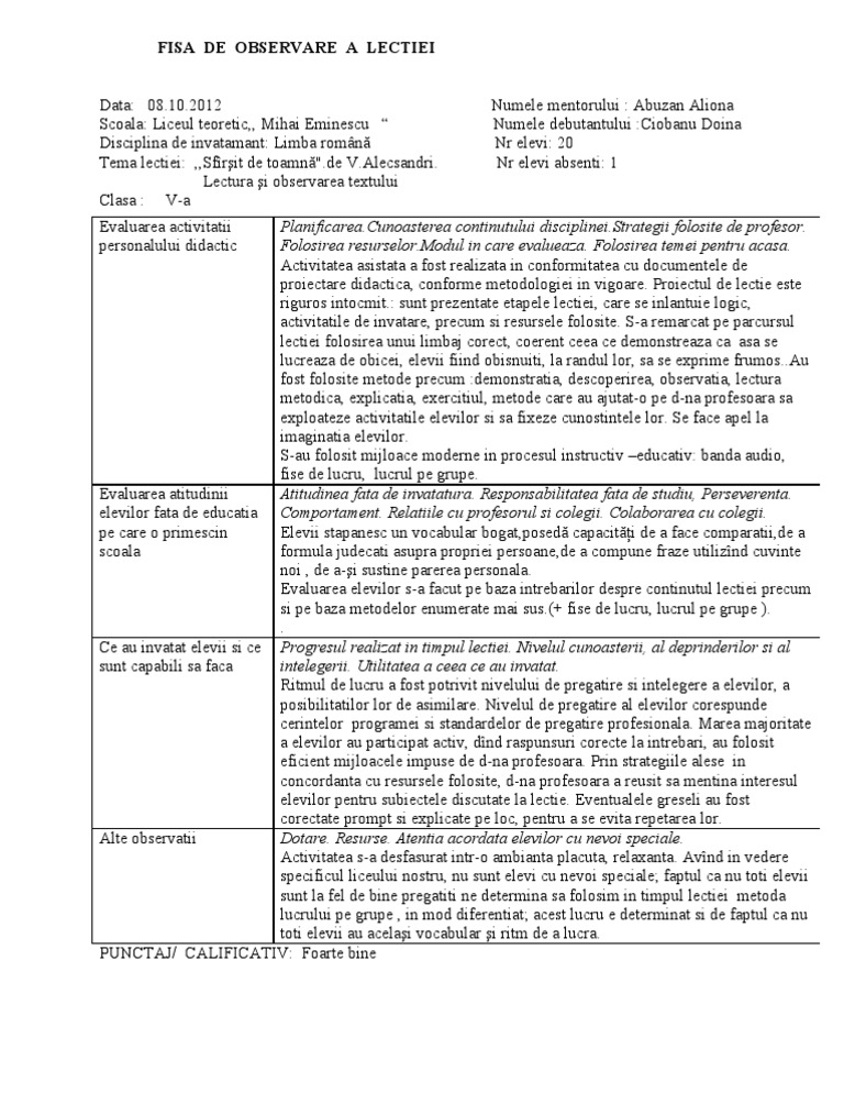 Fisa De Observare A Lectiei Model Completata Gradinita