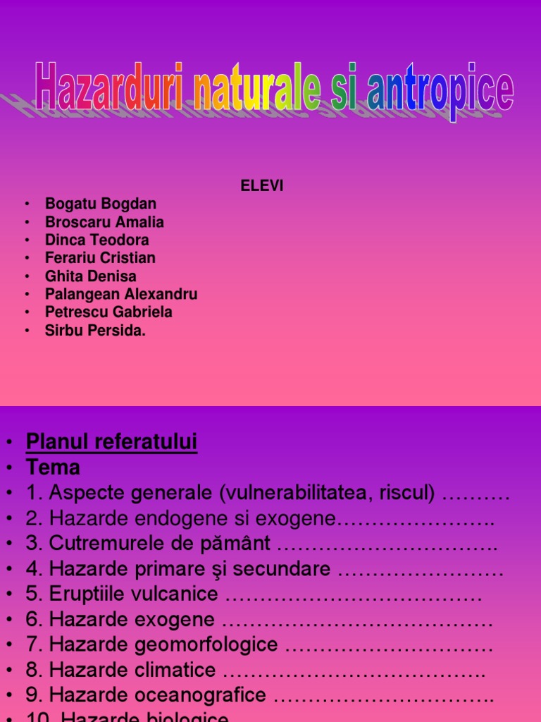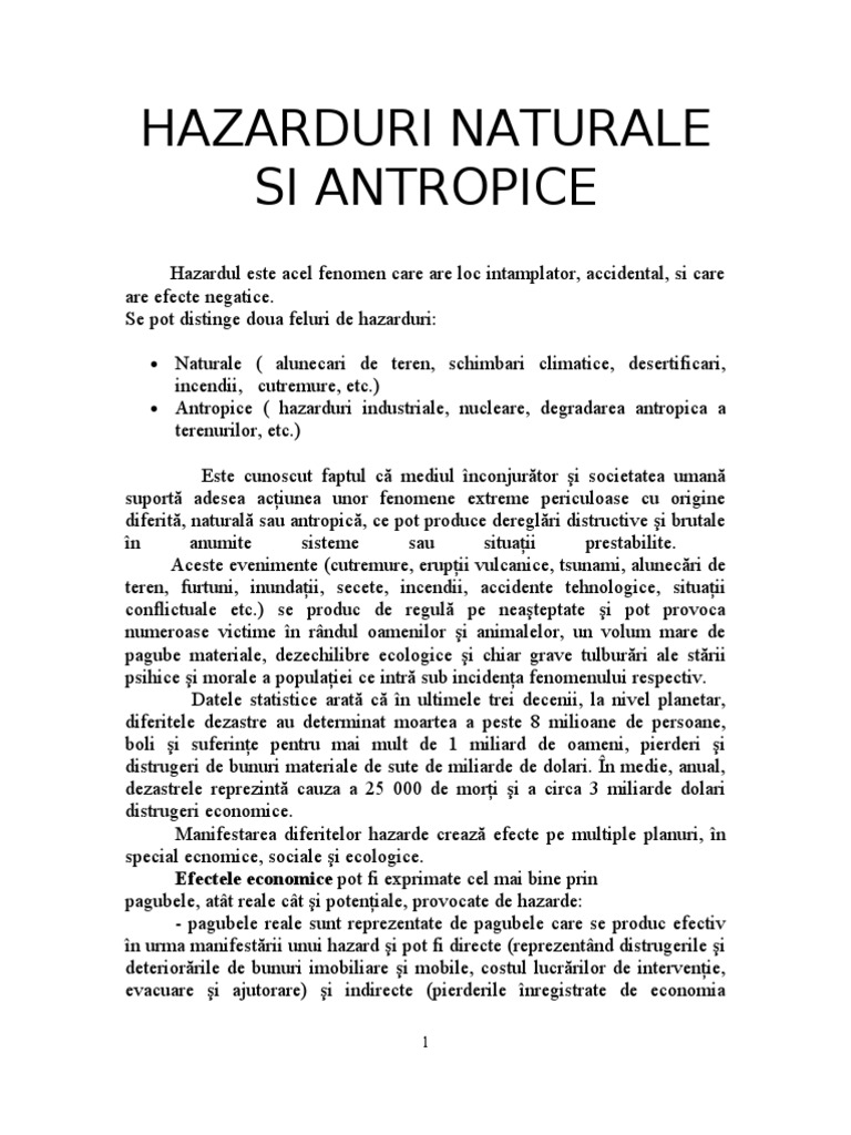 Hazarduri naturale si antropice. Hazardurile naturale pot ficlasifi cate în funcţie de diferite criterii între care modul de formare geneza durata de manifestare arealul afectat etc. Www referat ro hazarde naturale si antropice. Hazardurile naturale se impart in. Hazardurile antropice produc pagube mari și mici distrug mediul înconjurător și duc la pierderi de vieți omenești.