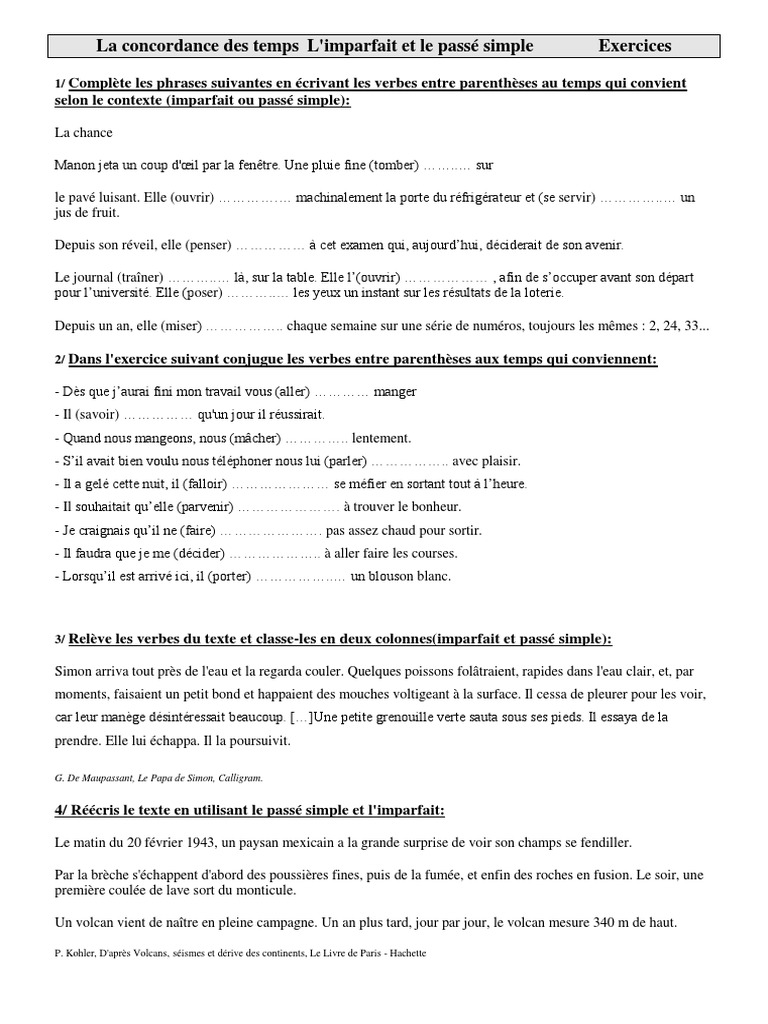 Exercices De Conjugaison Cm2 Cycle 3 La Concordance Des Temps Limparfait Et Le Passe Simple Volcan La Nature