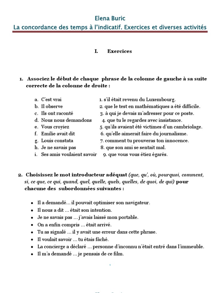 Exercices Concordance Des Temps Concordance Des Temps A L Indi