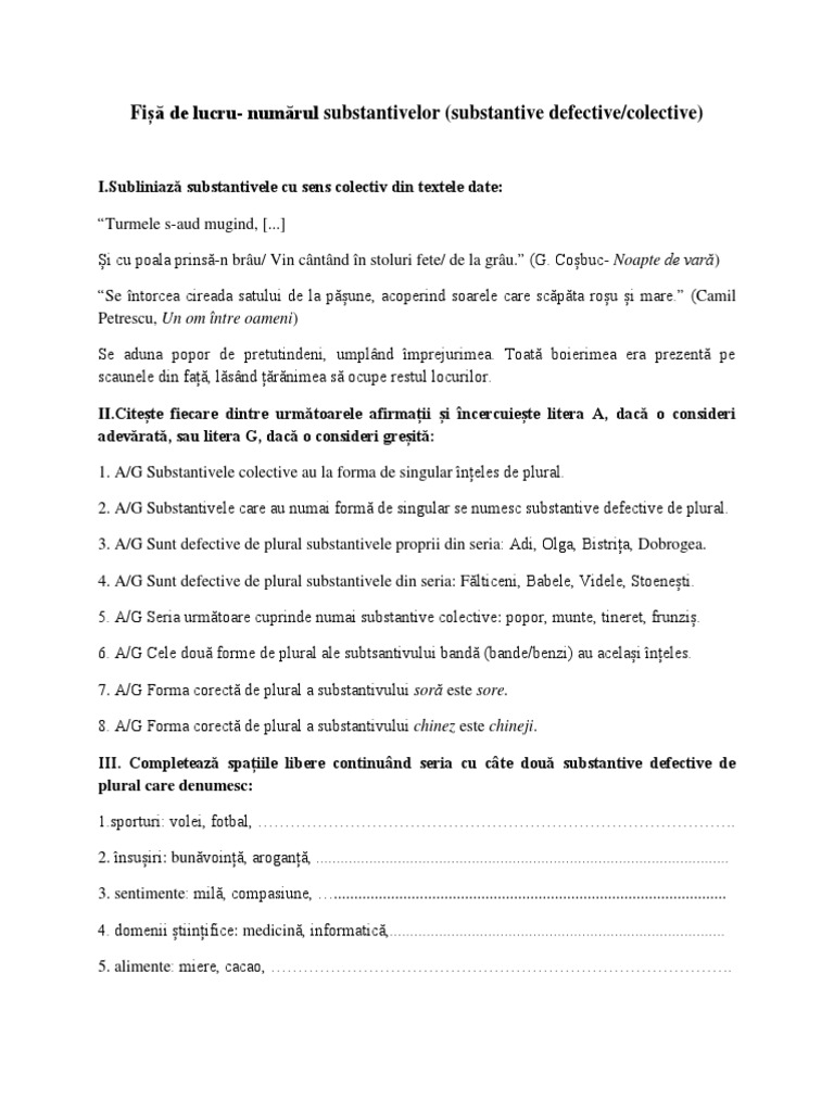 Fișă De Lucru Substantivele Defective Colective